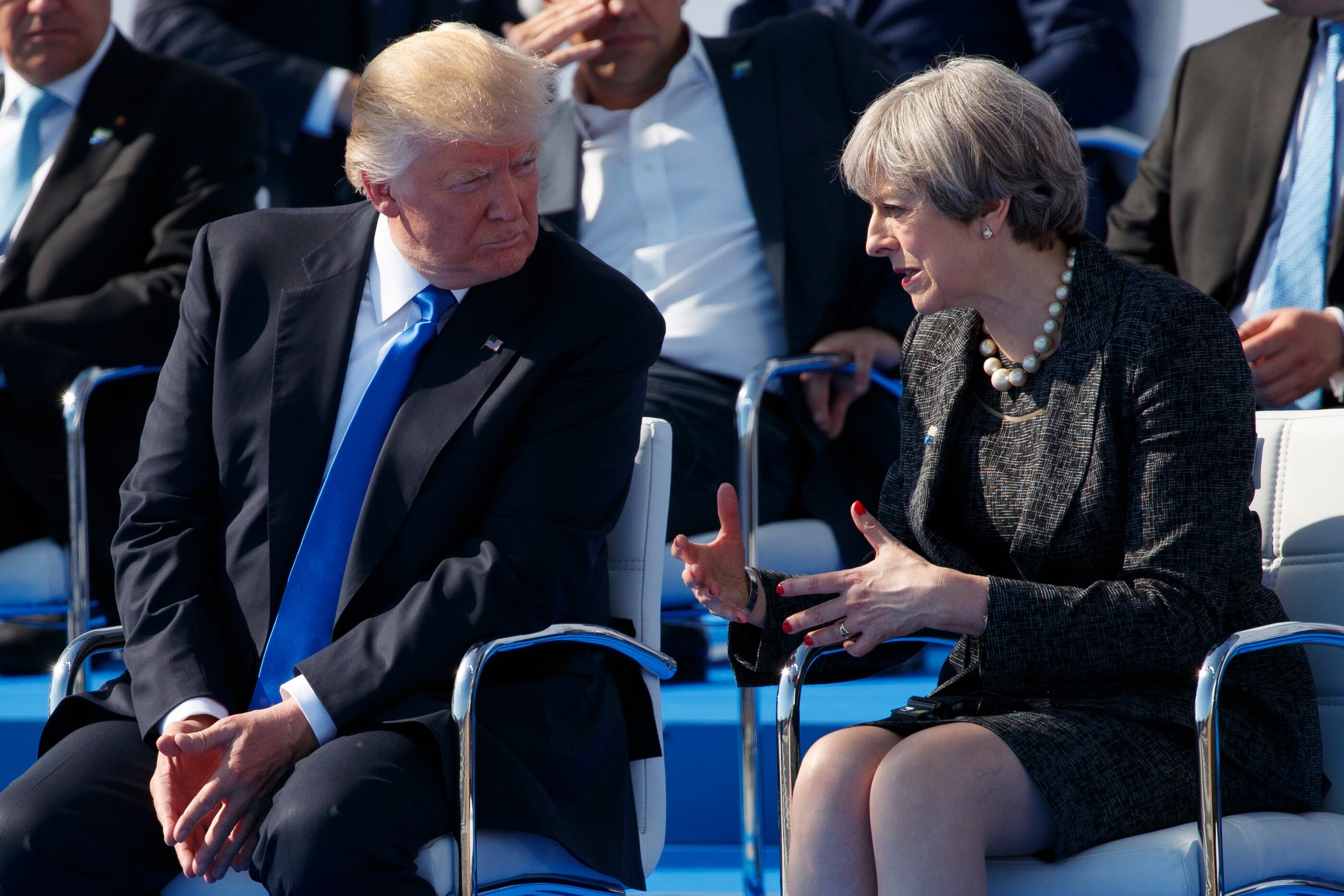 President Donald Trump talks with British Prime Minister Theresa May during a transfer ceremony at the new NATO headquarters, Thursday, May 25, 2017, in Brussels.