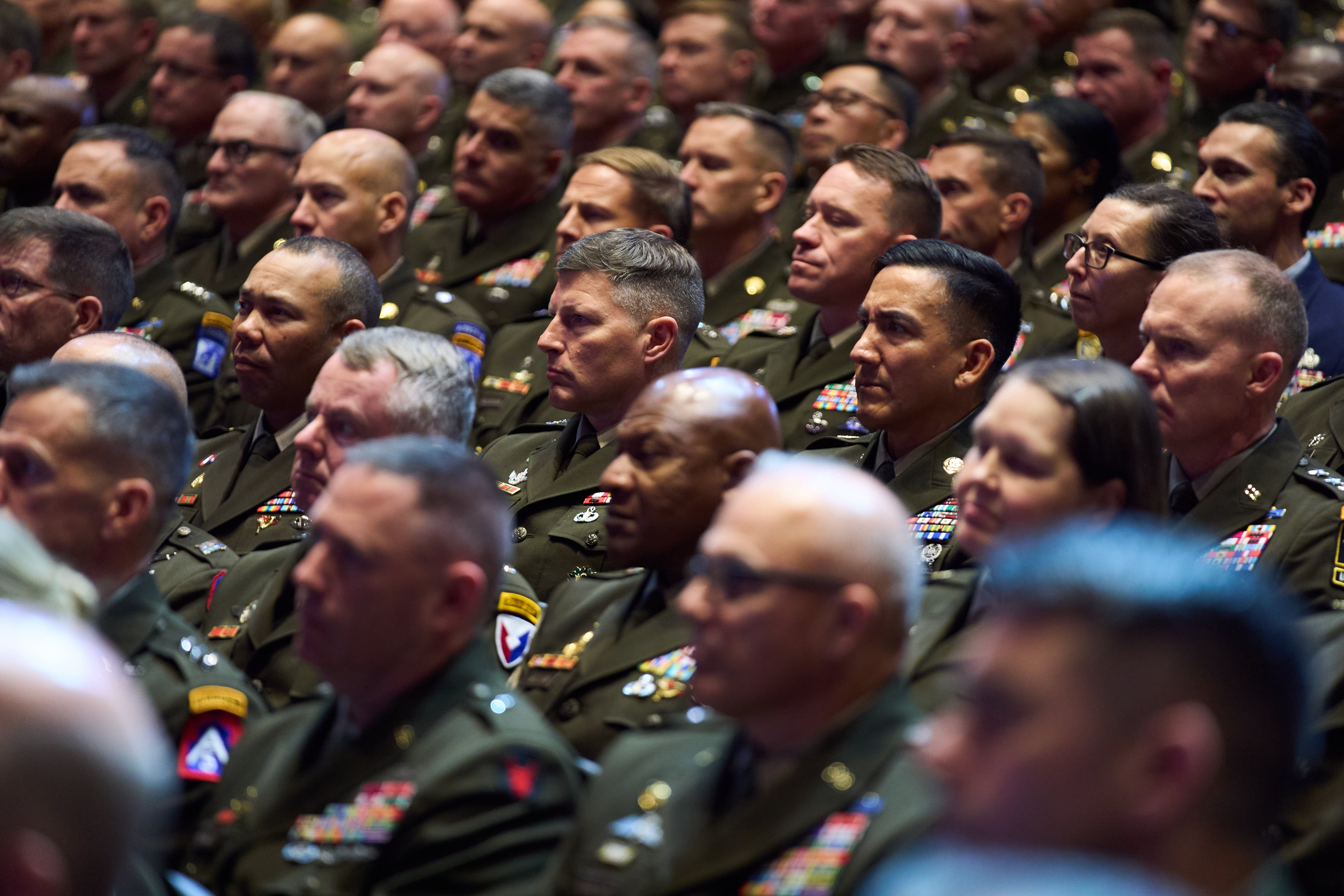 Top U.S. military commanders listen as President Donald Trump speaks at Marine Corps Base Quantico, Tuesday, Sept. 30, 2025, in Quantico, Virginia. (Evan Vucci/AP)