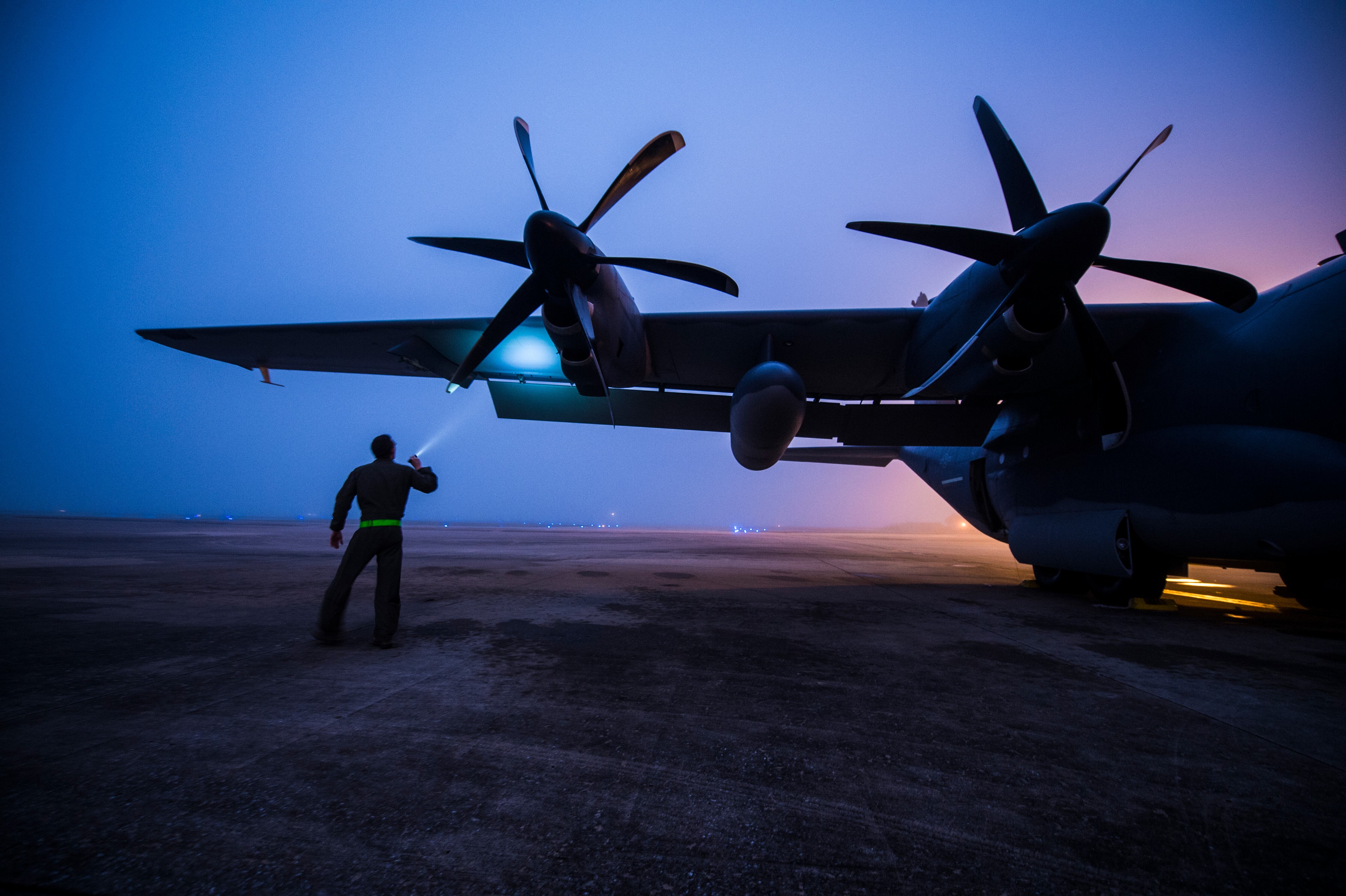 Staff Sgt. Derek Watson, a special missions aviator with the 1st Special Operations Group Detachment 2, inspects a wing of an AC-130J Ghostrider during a pre-flight inspection at Hurlburt Field, Fla., Feb. 2, 2016.