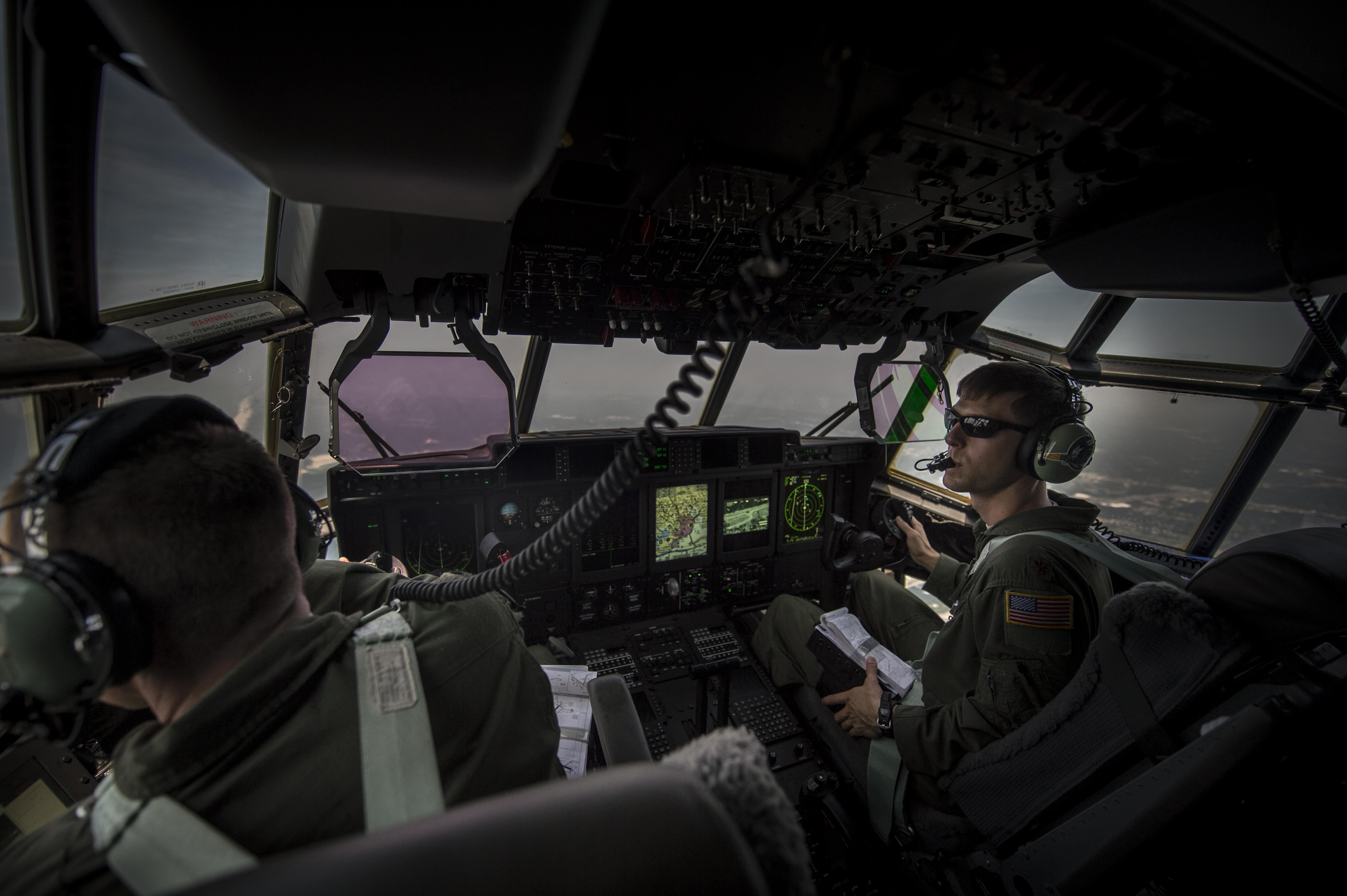 Maj. Brian Pesta, right, 1st Special Operations Group Detachment 2 pilot, and Maj. Jason Fox, 18th Flight Test Squadron pilot, look out the left window during the delivery flight of Air Force Special Operations Command's first AC-130J Ghostrider.