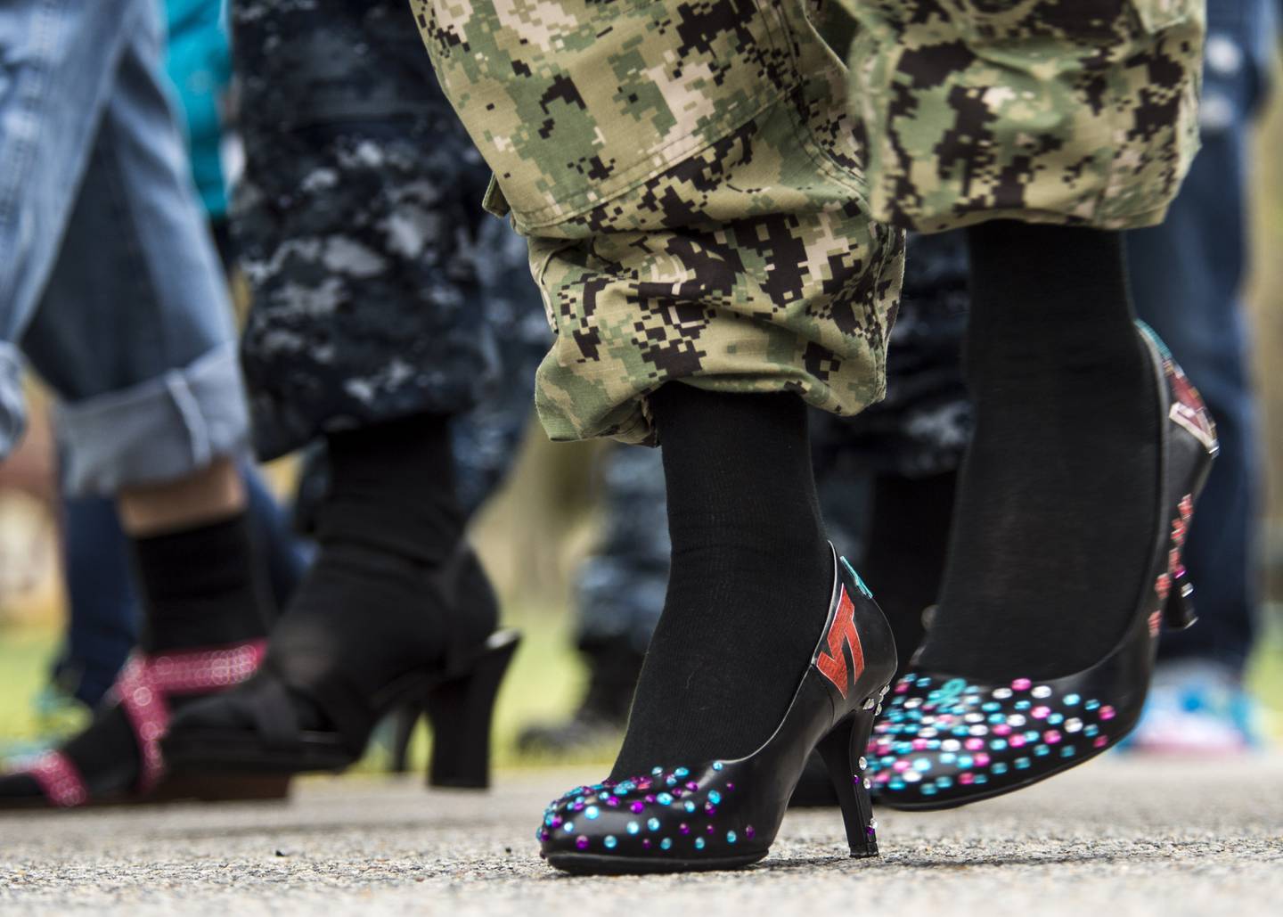 Other services also have participated in the Walk a Mile in Her Shoes awareness effort. Here, service members at Joint Expeditionary Base Little Creek-Fort Story, Va., don heels for an April 2014 event.