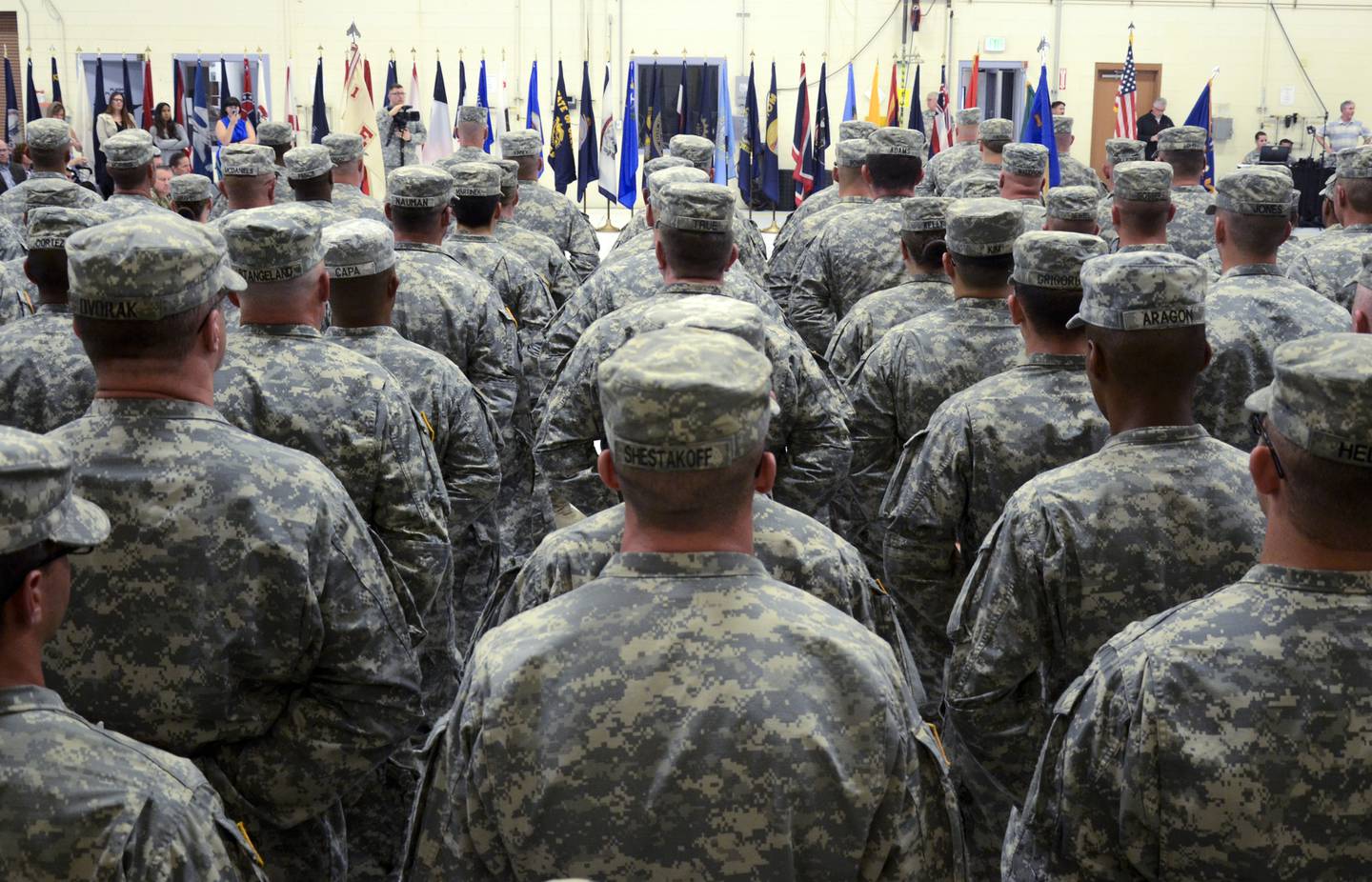 Members of 1st Battalion, 168th Aviation Regiment, participate in a deployment ceremony, Oct. 4, 2015, for their deployment early next year to the Middle East. Hundreds of Soldiers and family members packed the Army Aviation Support Facility, where the ceremony was held on Joint Base Lewis-McChord.