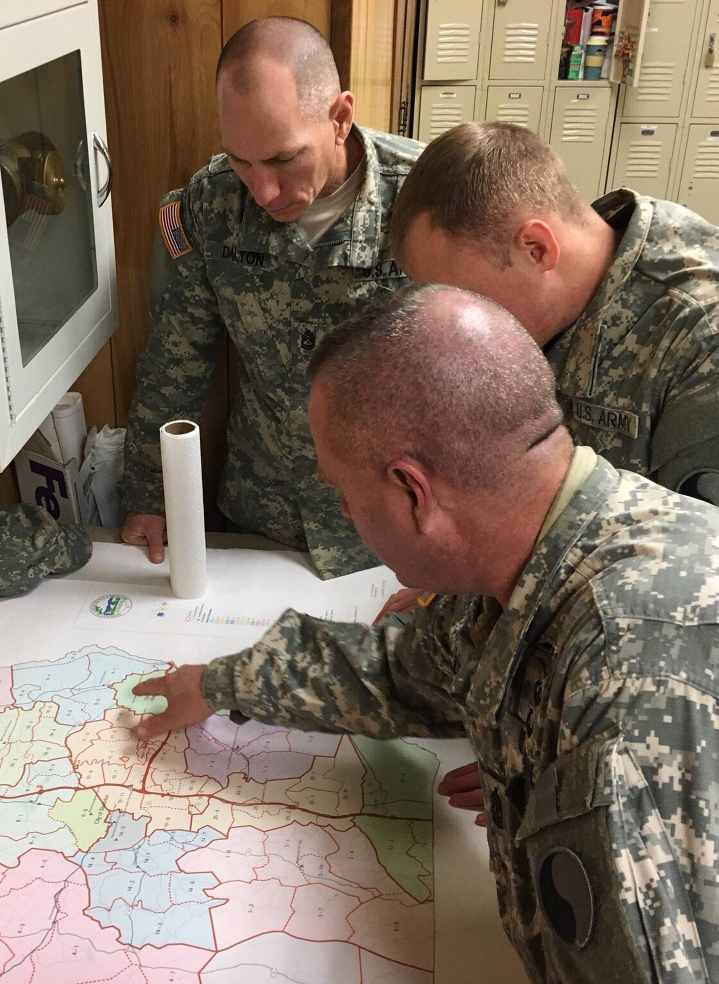 Virginia National Guard Soldiers assigned to the Staunton-based Headquarters Company, 116th Infantry Brigade Combat Team conduct an initial coordination meeting with Augusta County Fire and Rescue to discuss possible snow response operations Jan. 22, 2016, near Staunton, Virginia.