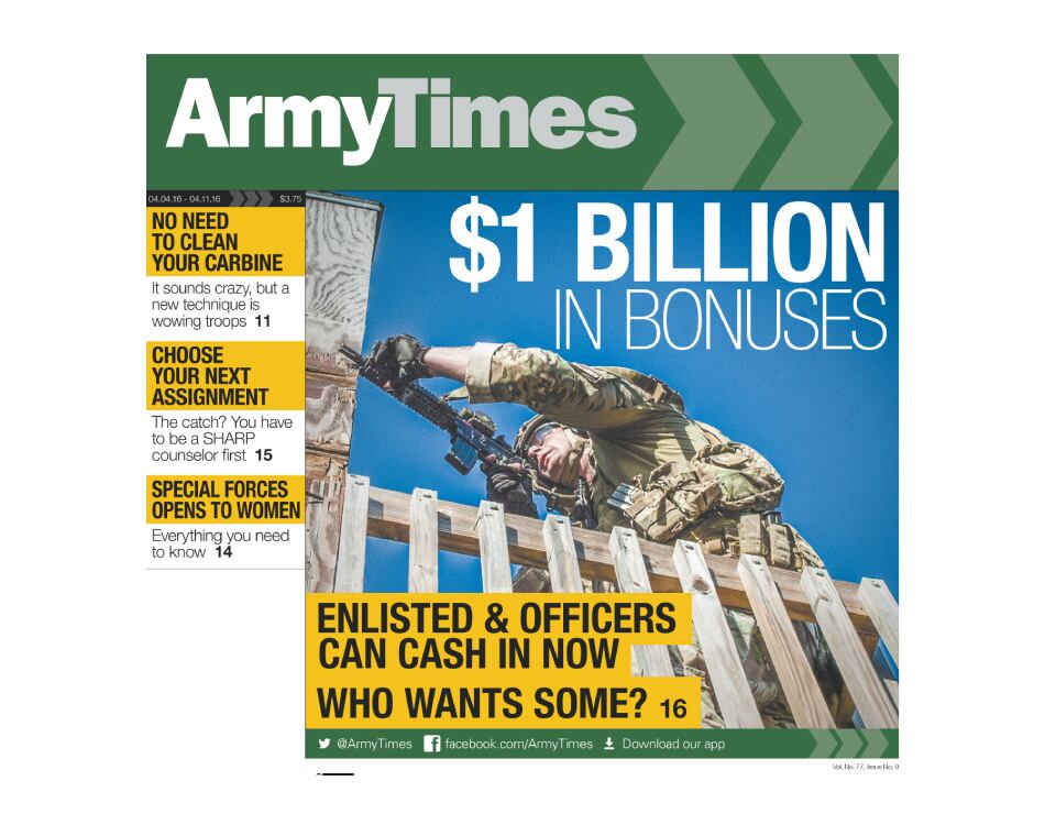 In this week's Army Times, enlisted and officers can cash in now for $1 billion in bonuses. Get your own copy starting Monday at your local exchange or commissary.
