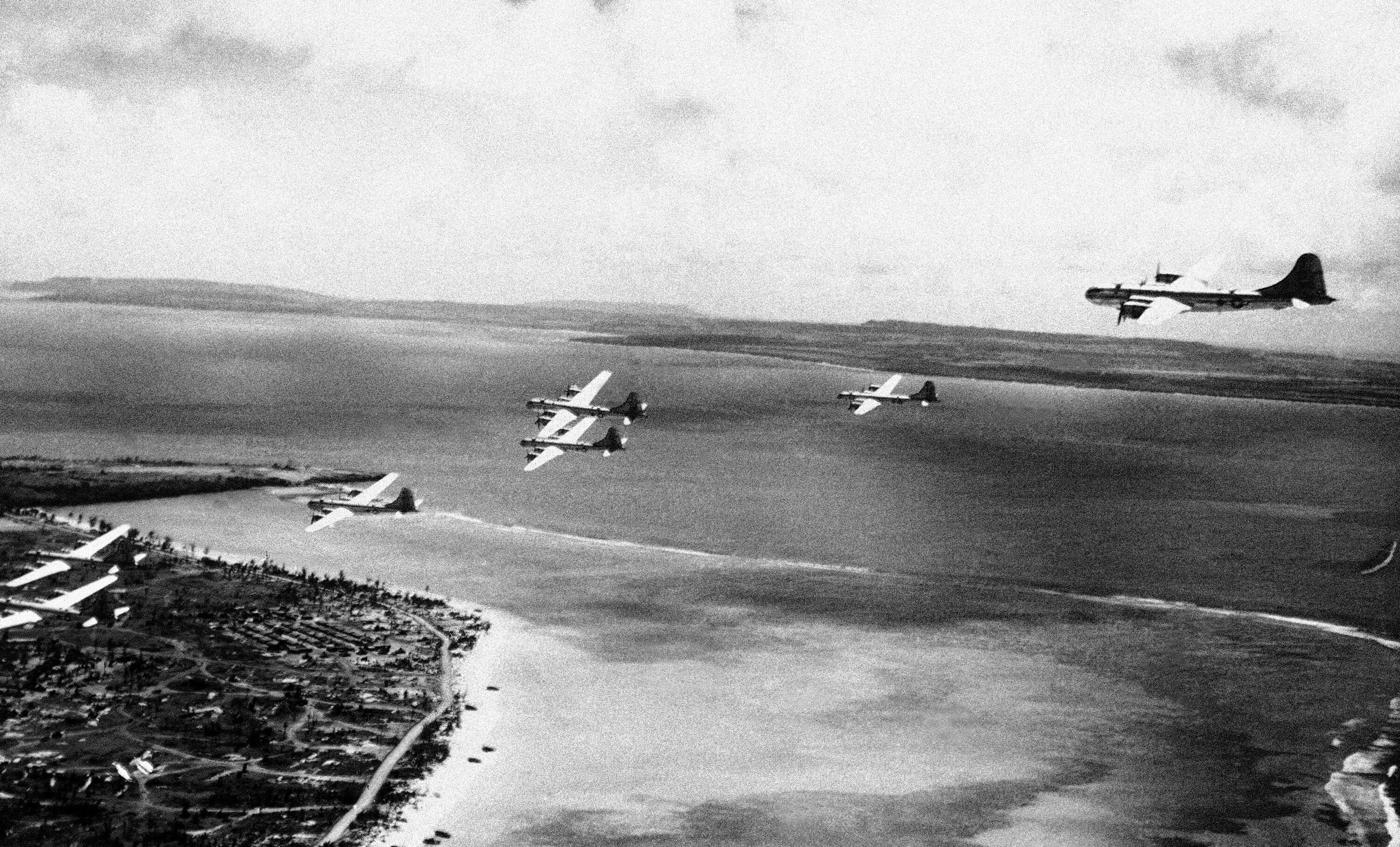 A formation of mighty B 29 Super-Fortresses, from bases at Saipan bank into a turn over the Marians, on Dec. 5, 1944, during preparations for the initial attack by Super-fortresses against Tokyo.