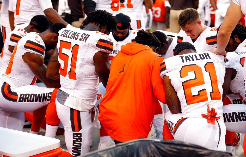 Nearly a dozen Browns players knelt during the anthem Aug. 21, including tight end Seth DeValve, the first known white NFL player to do so. On Saturday, all players from both sides of the Browns-Tampa Bay Buccaneers game stood, with about 30 Browns linking arms on the sideline as the anthem played.