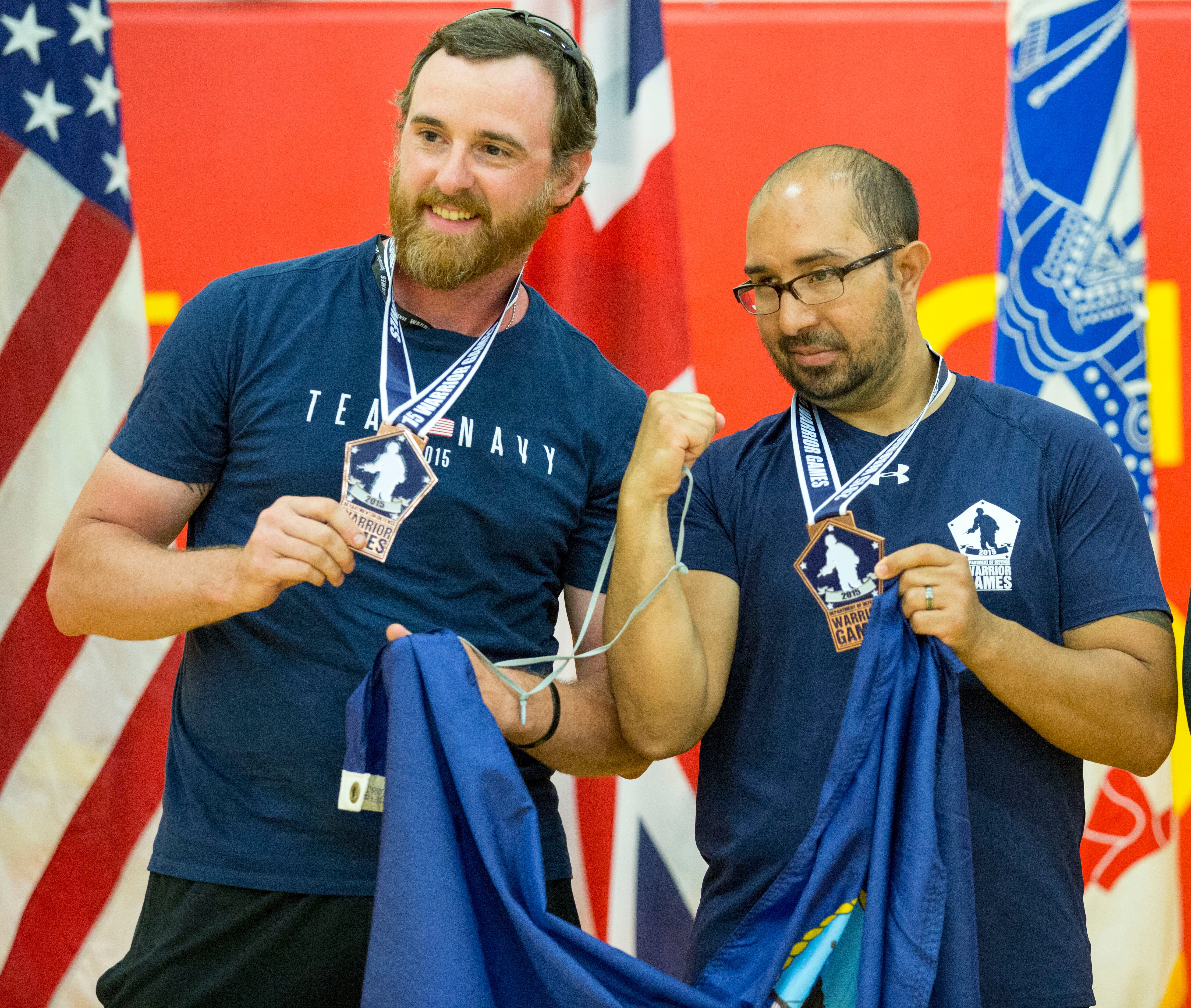 Members of the Navy team show off their medals during the award ceremony for track and field events at the 2015 Warrior Games in Quantico, Virginia.