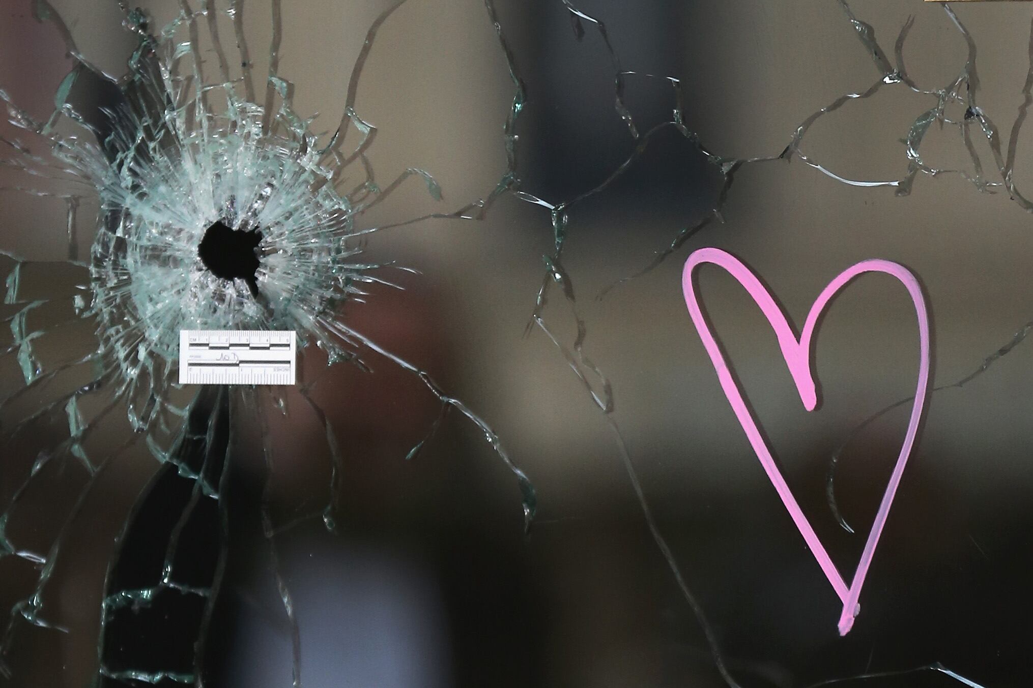 A heart adorns the bullet damaged window of the Casa Nostra Cafe in Paris.