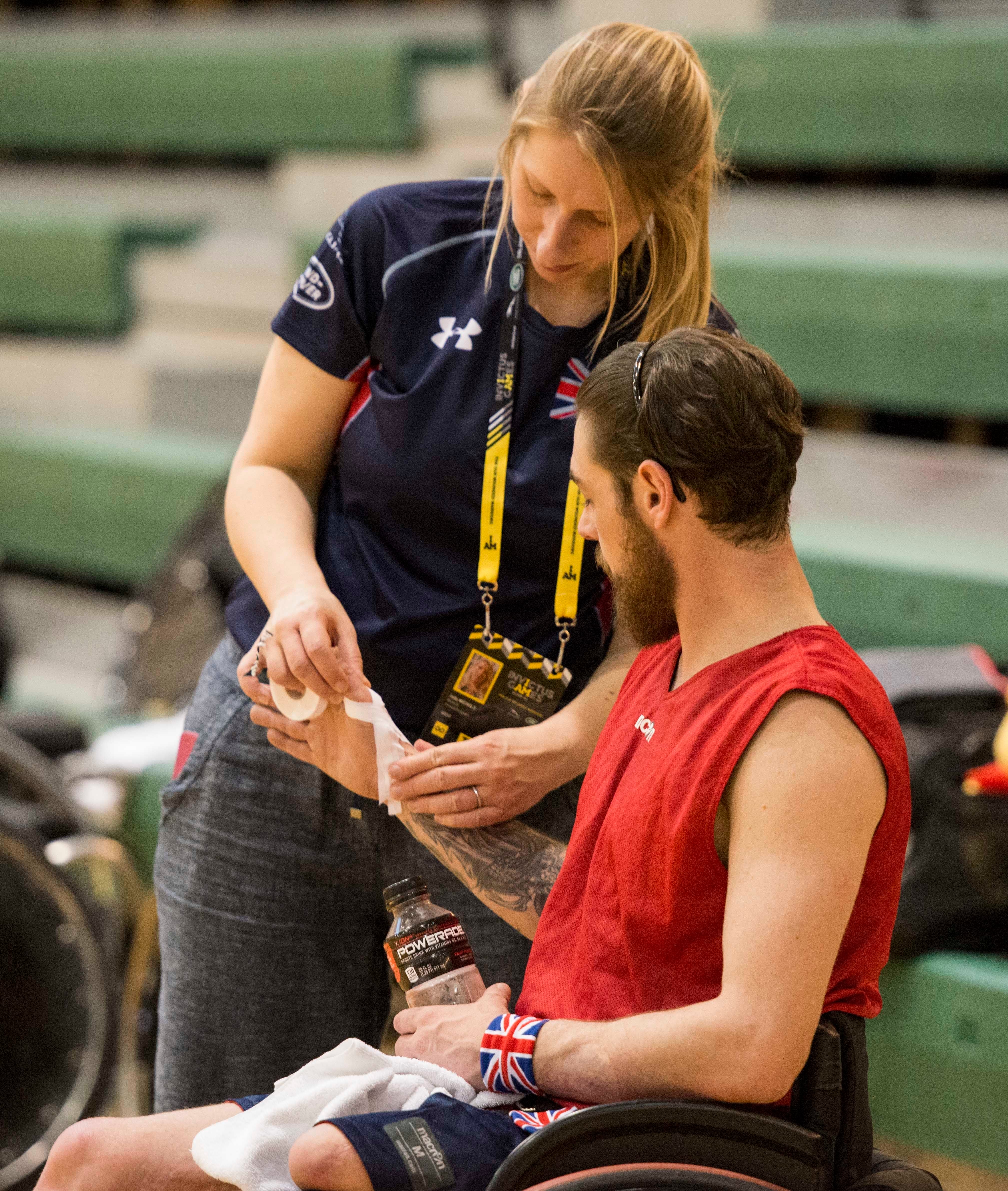 Retired British Army Sgt. Chris Middleton receives a hand wrap from an exercise physiologist during a training wheelchair basketball game at the ESPN Wide World of Sports complex at Walt Disney World, Orlando, Fla., May 5, 2016. Middleton plays for a local team in Leicester. Team U.K. is one of 15 nations competing in the Invictus Games, which was created by Prince Harry, a former British Army officer and son of Prince Charles, the Prince of Wales.