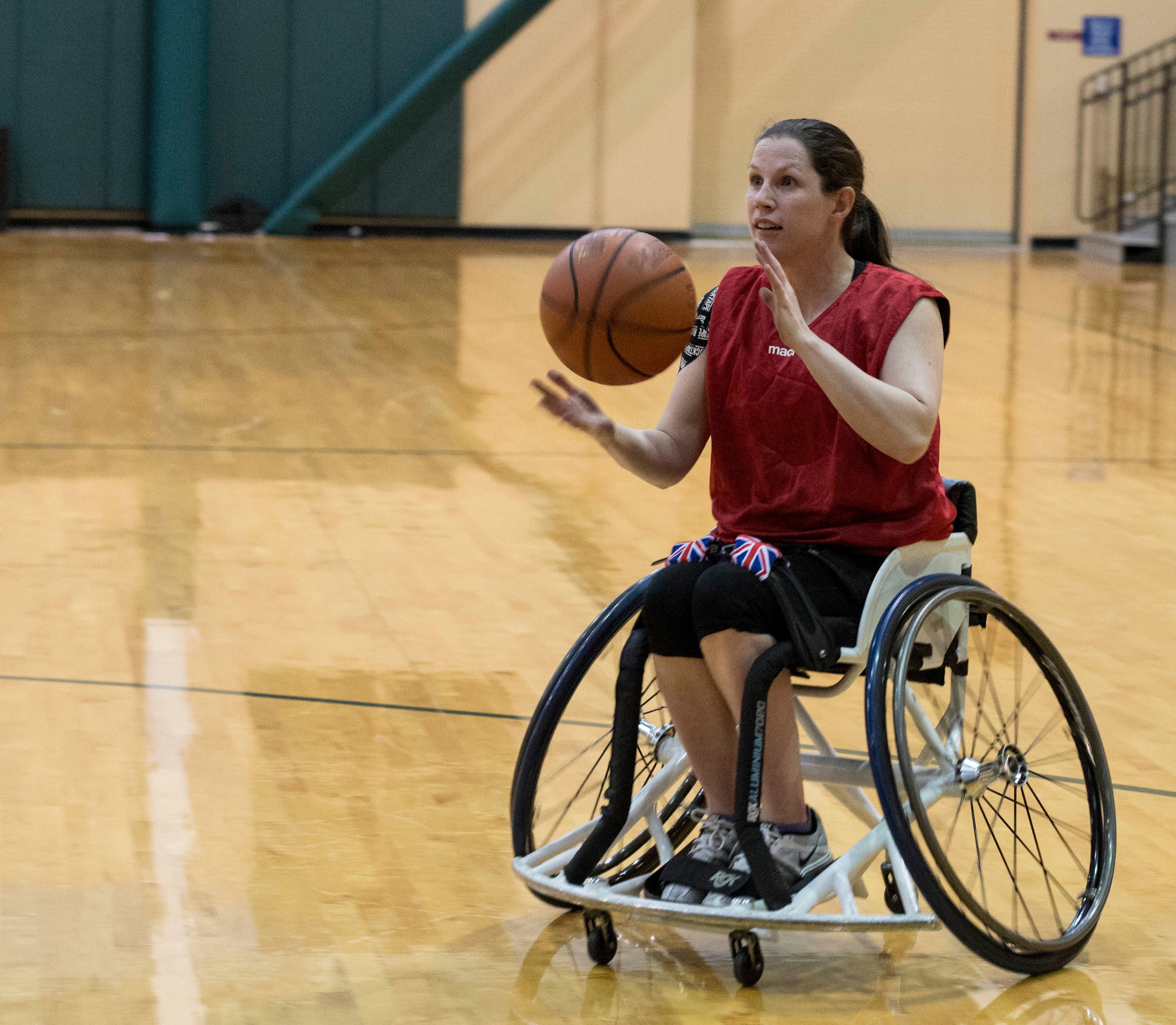 Royal Navy Lt. Kirsty Wallace, Team U.K., receives a pass just inside the 3-point area and then takes a shot during a training wheelchair basketball game at the ESPN Wide World of Sports complex at Walt Disney World, Orlando, Fla., May 5, 2016. Team U.K. is one of 15 nations competing in the Invictus Games, which was created by Prince Harry, a former British Army officer and son of Prince Charles, the Prince of Wales.