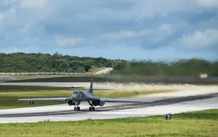 An. Air Force B-1B Lancer assigned to the 37th Expeditionary Bomb Squadron, deployed from Ellsworth Air Force Base, South Dakota, takes off from Andersen Air Force Base, Guam, for a 10-hour mission, flying in the vicinity of Kyushu, Japan, the East China Sea, and the Korean peninsula, Aug. 8, 2017. (Tech. Sgt. Richard P. Ebensberger/Air Force)