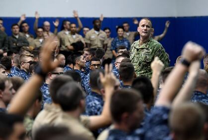 Master Chief Petty Officer of the Navy Steven S. Giordano speaks to aailors, airmen and Marines on Aug. 16, 2017, during an all-hands call on Joint Base Charleston, S.C. (MC1 John P. Curtis/Navy)
