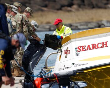 Water safety officials hand over materials to military personnel stationed at a command center at a boat harbor, Wednesday, Aug. 16, 2017, in Haleiwa, Hawaii. An Army helicopter with five on board crashed several miles off Oahu's North Shore late Tuesday. (Marco Garcia/AP)