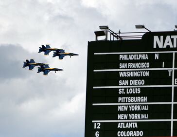 The Blue Angels perform a flyover at Wrigley Field during a baseball game between the Chicago Cubs and the Cincinnati Reds on Thursday, Aug. 17, 2017, in Chicago. (David Banks/AP)