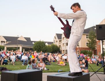 Musician 2nd class Dan Webber, assigned to the U.S. Navy Band Northwest popular music group, Passage, performs at the St. John's Summer Concert Series on Aug. 17 during Navy Week Montana. (MC2 James Vazquez/Navy)