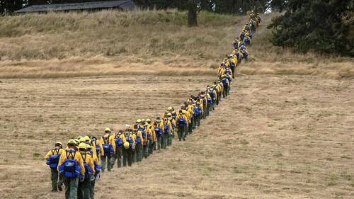 Oregon National Guard soldiers and airmen hike to a training area in Salem, Ore., Aug. 15, 2017, for firefighting refresher training as they prepare to support wildfire response efforts. (Master Sgt. John Hughel/Air National Guard)