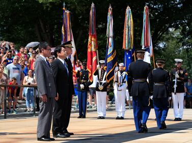 Japanese Foreign Minister Taro Kono, left, and Defense Minister Itsunori Onodera, are escorted by host Maj. Gen. Scott Berrier, special assistant to the director of the U.S. Army staff, during a wreath-laying ceremony at the Tomb of the Unknowns, Wednesday, Aug. 16, 2017, at Arlington National Cemetery in Arlington, Va. (Manuel Balce Ceneta/AP)