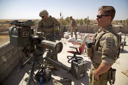 U.S. soldiers stand next to a guided-missile launcher, a few miles from the frontline, in the village of Abu Ghaddur, east of Tal Afar, Iraq, Sunday, Aug. 20, 2017. Iraqi forces have launched a multi-pronged assault to retake the town of Tal Afar, west of Mosul, marking the next phase in the country's war on the Islamic State group. (Balint Szlanko/AP)