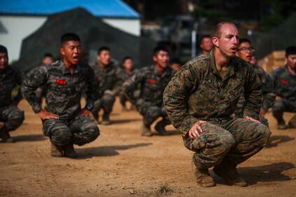 U.S. Marines assigned to Charlie Company, 1st Battalion, 3rd Marine Regiment, exercise with Republic of Korea Marines during Korean Marine Exchange Program (KMEP) 17-14 aboard the North West Islands, Republic of Korea, Aug. 10, 2017. (Cpl. Aaron S. Patterson/Marine Corps)