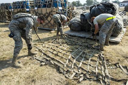 Airmen assigned to the Air Force's 821st Contingency Response Support Squadron prepare cargo to be loaded on aircraft at Yakima Air Terminal-McAllister Field, Yakima, Wash., Aug. 10, 2017. (Tech. Sgt. Jared Becker/Air Force)