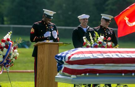 Sgt. Freemon Draw shares a funny story about Lance Cpl. Cody Haley Saturday, Aug. 19, 2017, during his funeral service as Hospitalman 3rd Class John Stillwell and Sgt. David Hommes laugh and smile on, in Eldora, Iowa. Haley died in a training accident at Camp Pendleton, California on Aug. 4. (Chris Zoeller/Globe-Gazette via AP)