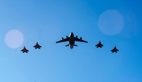 A C-17 Globemaster III and four F-22 Raptors fly in formation on Sept. 26, 2017, over Joint Base Pearl Harbor-Hickam. (Tech. Sgt. Heather Redman/Air Force)