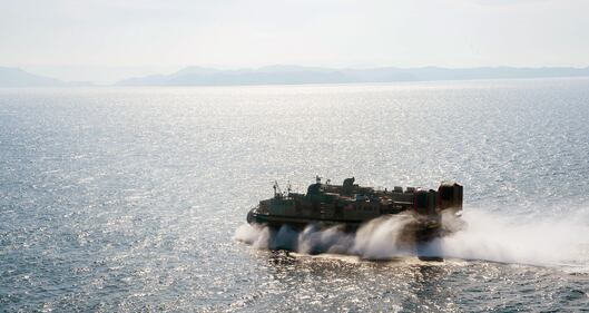 Landing craft air cushion (LCAC) 9, assigned to Naval Beach Unit (NBU) 7, disembarks the amphibious assault ship USS Bonhomme Richard (LHD 6) on Sept. 25, 2017, as the ship arrives to Sasebo, Japan, following a four-month deployment in the Indo-Asia-Pacific region. (MC3 Zachary DiPadova/Navy)