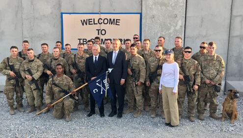 U.S. Secretary of Defense James Mattis, NATO Secretary General Jens Stoltenberg and Ambassador Kay Bailey Hutchison, pose for a photo with troops of the TAAC-East (Train, Advise, Assist Command – East) Command in Gamberi, Afghanistan. (NATO)