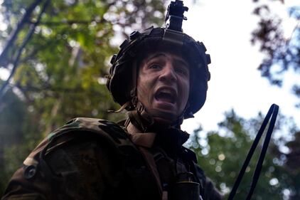 Marine with Marine Rotational Force-Europe yells instructions to the rest of his squad partaking in a firefight during Exercise Aurora 17 in Lärbro, Sweden, Sept. 21, 2017. Aurora 17 is the largest Swedish national exercise in more than 20 years, and it includes supporting forces from the U.S. and other nations in order to exercise Sweden’s defense capability and promote common regional security. (U.S. Marine Corps photo by SSgt. Marcin Platek/Released)