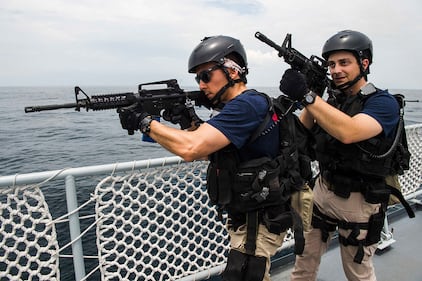 Fire Controlman 1st Class Richard E. Byrd and Lt. Jonathon Godbolt, assigned to the littoral combat ship USS Coronado (LCS 4), conducts visit, board, search, and seizure drills aboard Royal Malaysian Navy ship FD Lekir (F26) on Sept. 26, 2017, as part of Maritime Training Activity (MTA) Malaysia 2017 in the Malacca Strait. (MC2 Class Kaleb R. Staples/Navy)