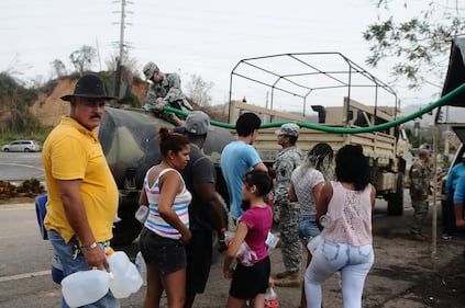 Puerto Rico National Guard members, along with employees from the Aqueducts and Sewers Authority of Puerto Rico, distribute water for the communities of Utuado, P.R., on Sept. 26, 2017. (Sgt. Jose Ahiram Diaz-Ramos/National Guard)