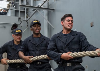 Sailors heave a mooring line during a sea and anchor detail Sept. 25, 2017, aboard the amphibious assault ship USS Bonhomme Richard (LHD 6) as the ship returns to Sasebo, Japan, following a four-month deployment in the Indo-Asia-Pacific region. (Mass Communication Specialist Seaman Cosmo Walrath/Navy)