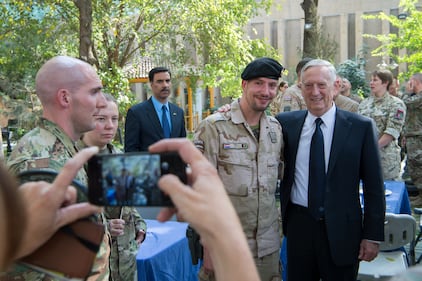 Secretary of Defense Jim Mattis meets with U.S. and international military members during his visit to Afghanistan on Sept. 27, 2017. (Air Force Staff Sgt. Jette Carr/DoD)