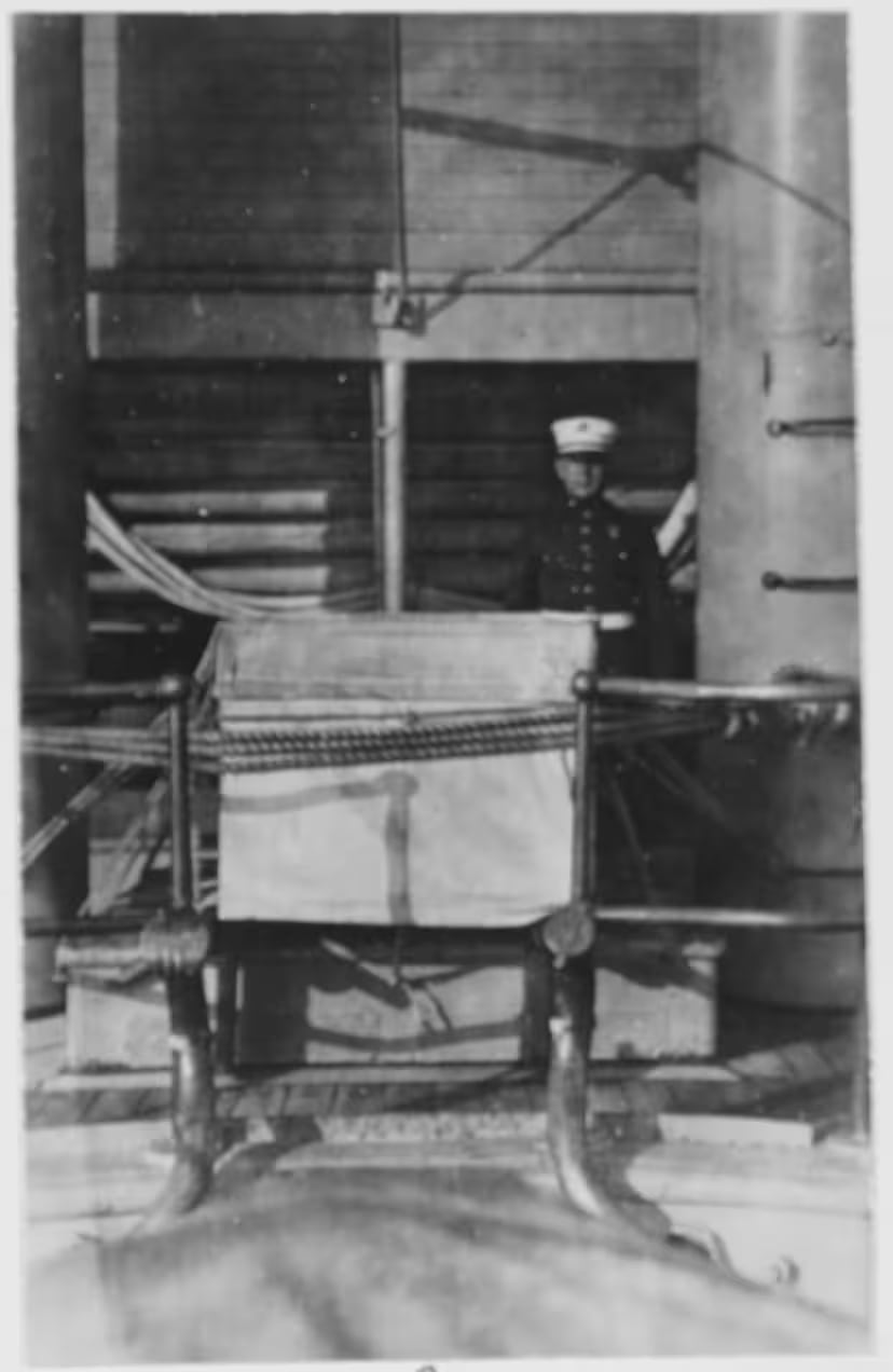 Twenty-foot seas broke over the Olympia but despite this, one Marine, lashed to the ship’s stanchions so as to not be washed overboard, stood guard over the Unknown Soldier at all times.