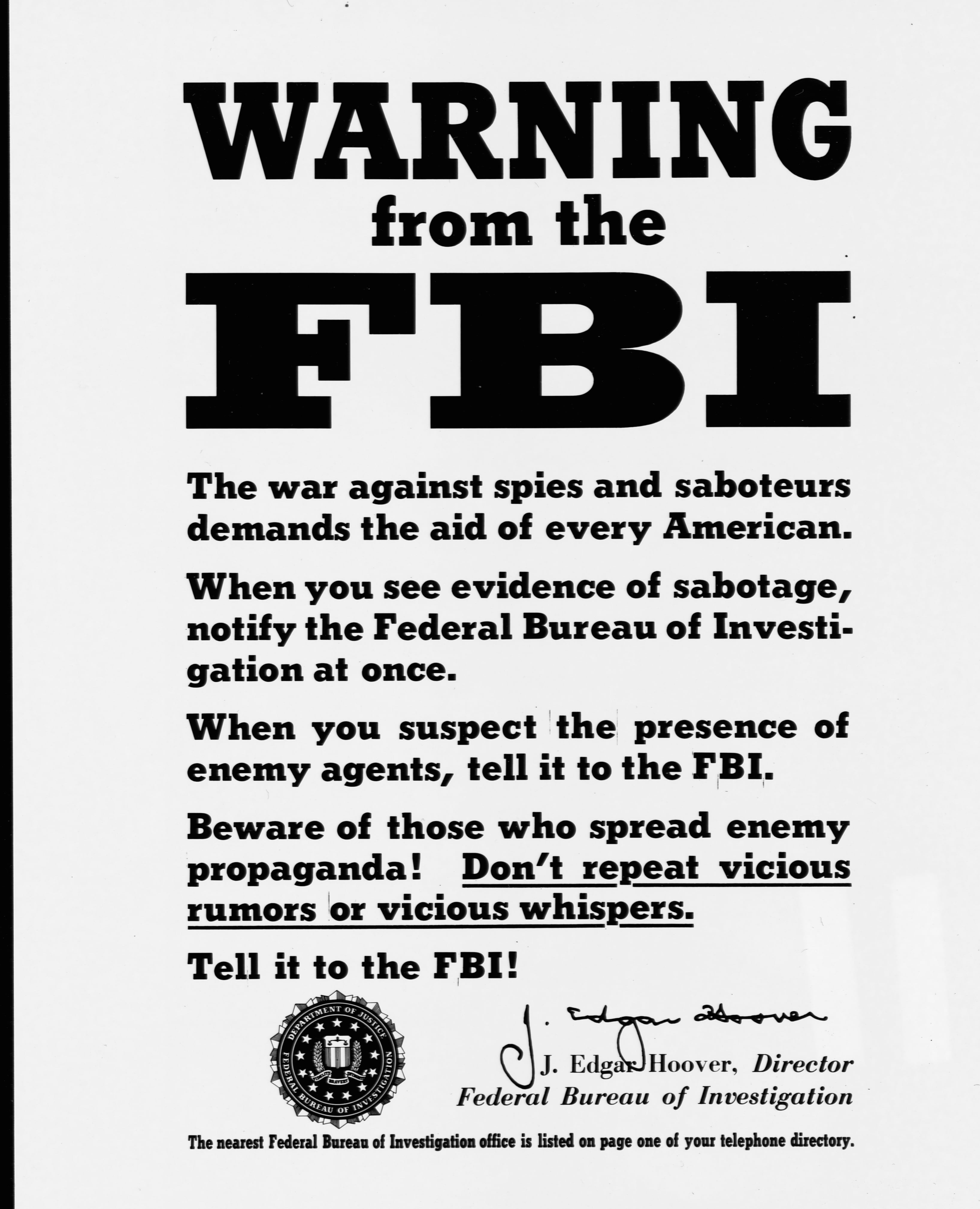 An F. B. I. poster signed by J. Edgar Hoover warns civilians against saboteurs and spies. (Library of Congress/Getty Images)